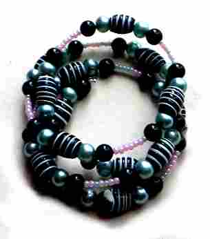 Black and white glass barrel beads and seed beads on memory wire bracelet