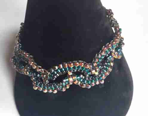 Beaded bracelet in a mix of blue/green, pink and gold seed beads.