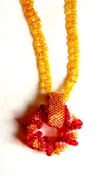 A beaded spiral pendant of topaz/purple, cream and red seed beads on a beaded chain