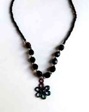 A small metal flower pendant with black faceted glass beads and seed beads
