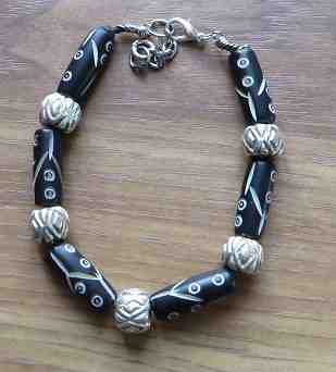Black bone tubes and chunky metal beads with patterns etched in them