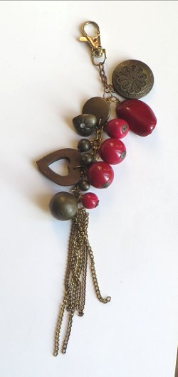 Red and gold chunky plastic beads and decorative metal disc on gold metal chain