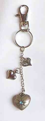 Various metal hearts on chain, the large heart at end has a 'gem' in centre