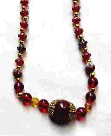 Deep red glass beads with gold beads and spacers.  The small red beads have a raised pattern and a gold ring around the edge