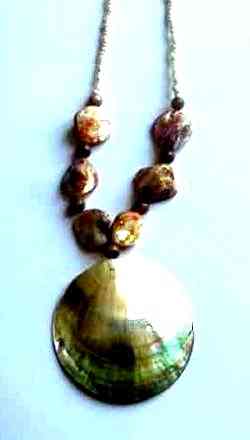 A pale shell disc, 5 cm diameter on a bead chain with orange brown