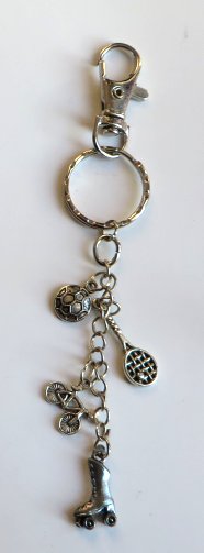 Metal sport charms on chain 5" long.    Charms are tennis racket, football,
