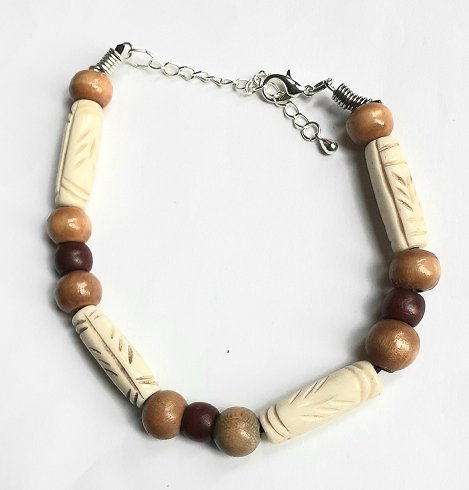 Cream white bone tubes with a carved leaf design and black and brown wooden beads