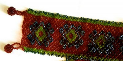 Beaded choker, green diamonds on a background of red and purple seed beads